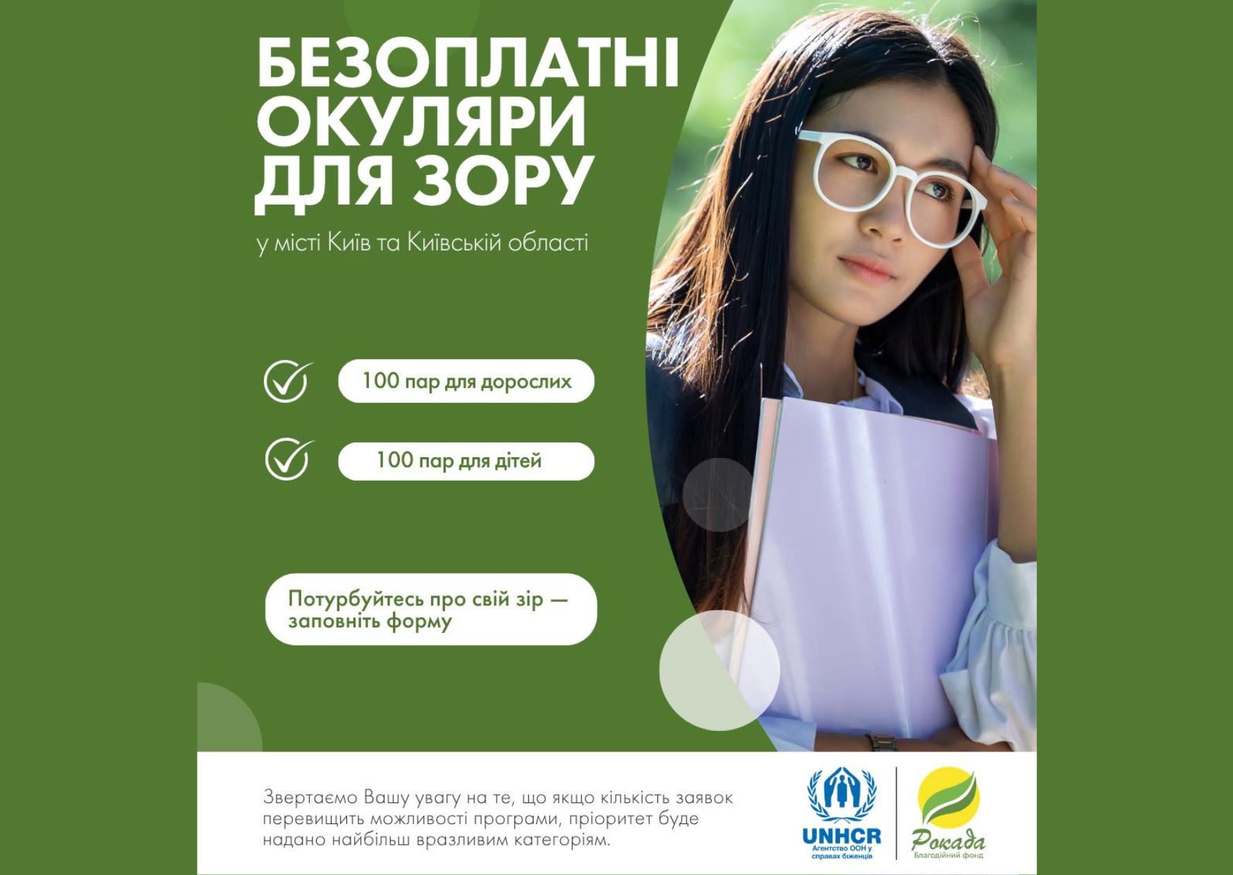 Благодійний фонд «Рокада» розпочинає ініціативу підтримки мешканців Києва та Київської області — видачу безоплатних окулярів для тих, хто цього потребує.