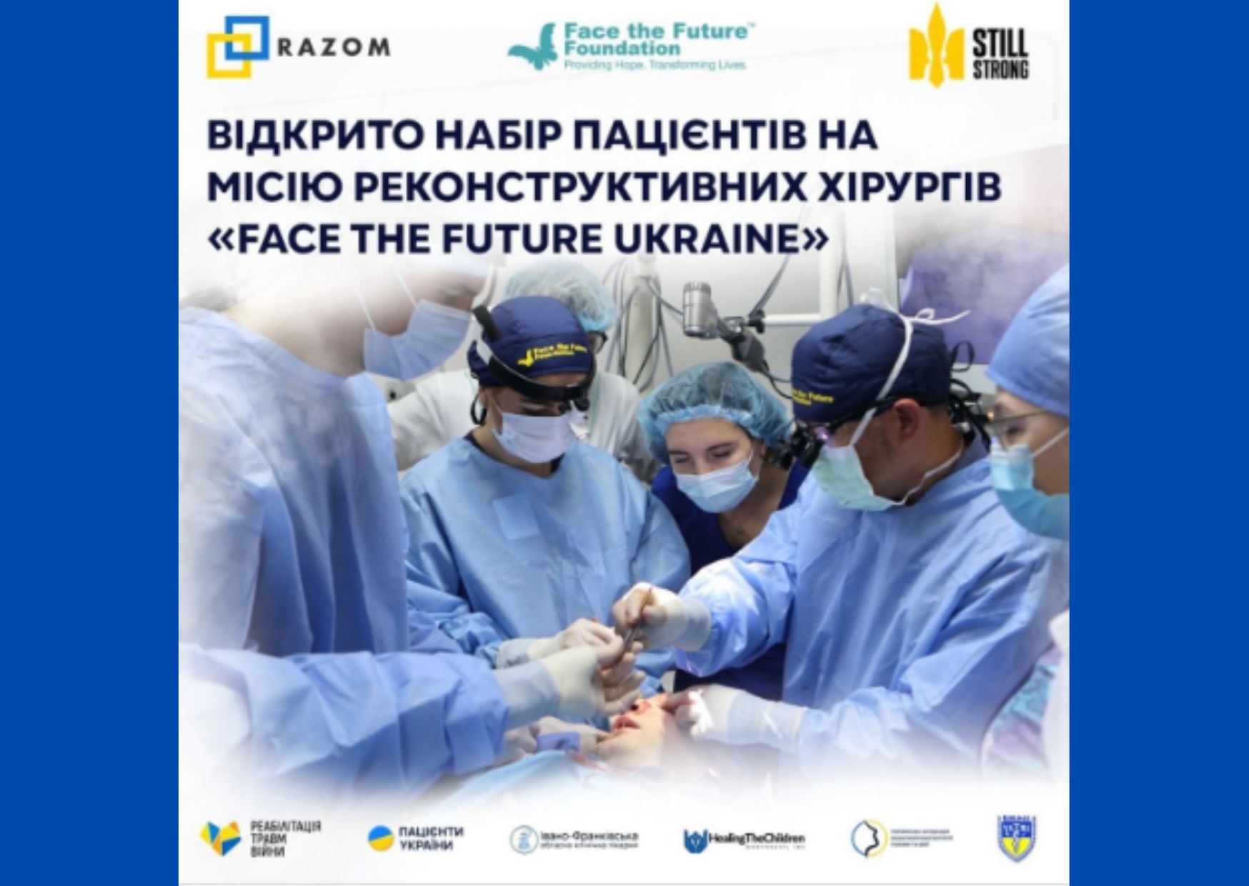 Пацієнтів з мінно-вибуховими травмами обличчя та шиї запрошують стати учасником 5-ї міжнародної місії та отримати безоплатні пластичні операції від команди спеціалістів з Канади, США та України. Під час минулих місій медики провели реконструктивні операції для понад 150 військових та цивільних з пораненими обличчями. Для пацієнтів, які втратили фрагменти кісток, біоінженери підготують індивідуальні пластини, щоб відновити цілісність кісток. Всі операції безоплатні для пацієнтів.